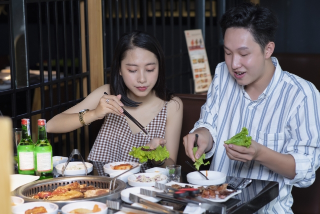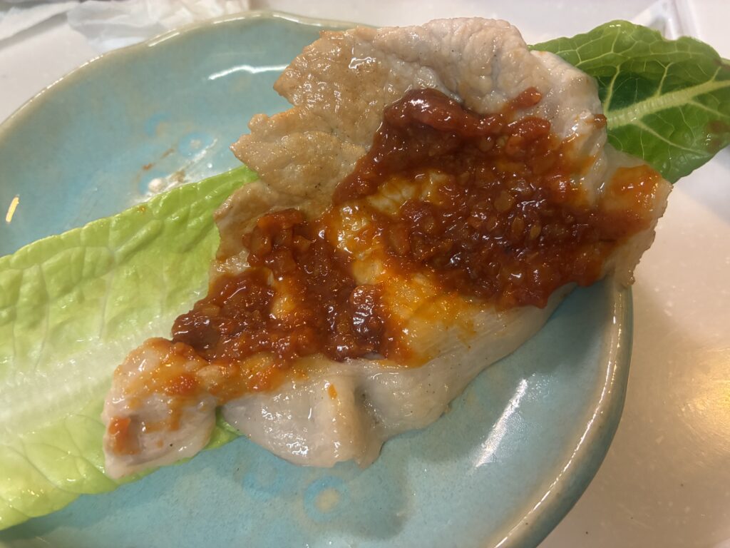 焼いた豚肉をロメインレタスで包んで、サムジャンをつけて食べる方法