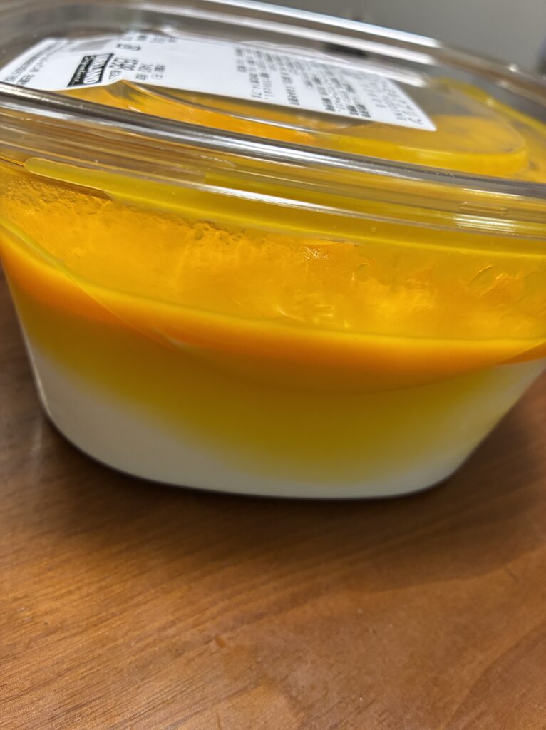 「マンゴープリン」だと思って買ったら、正確には「ミルクプリンにマンゴーをのせたもの」でした。