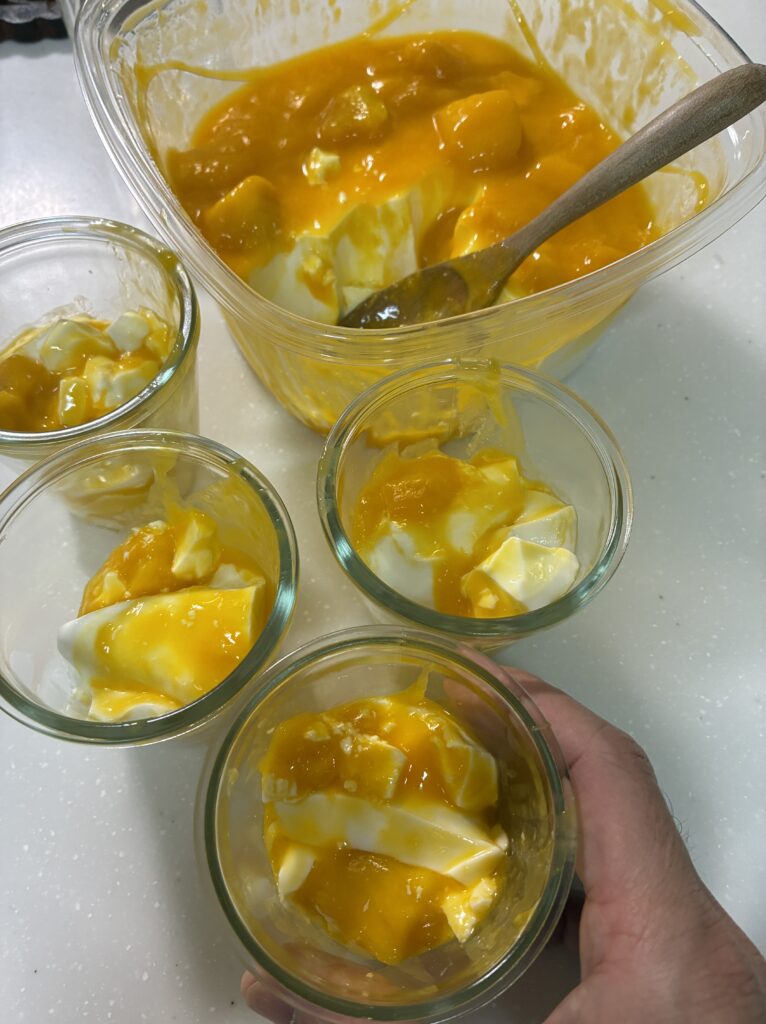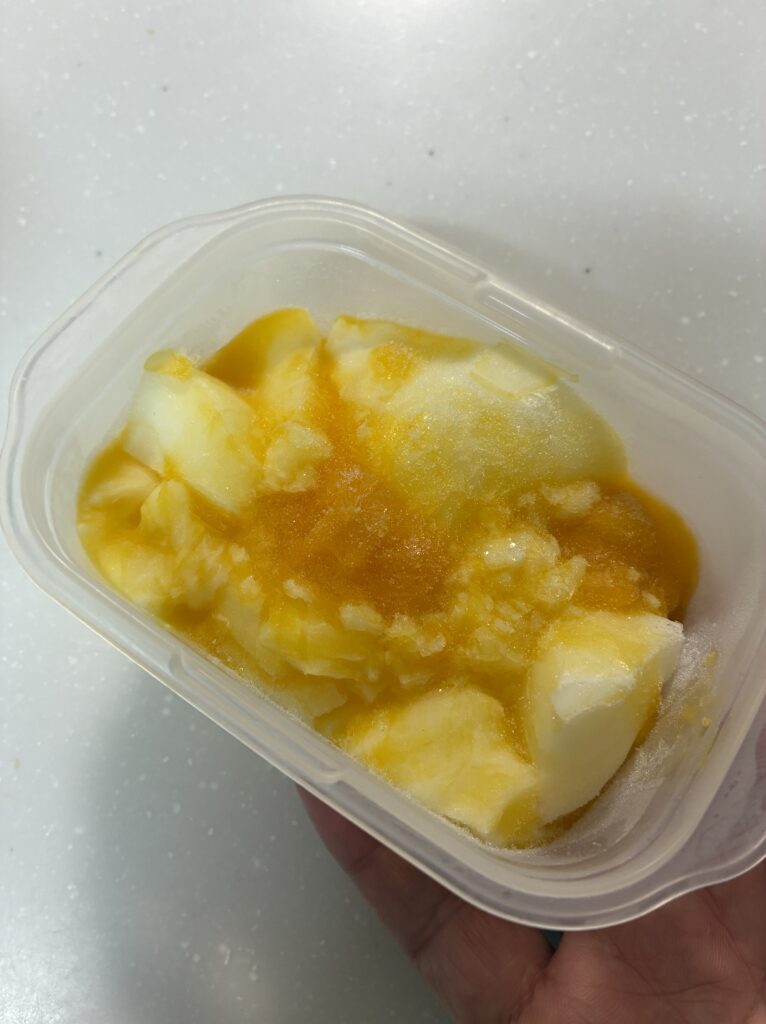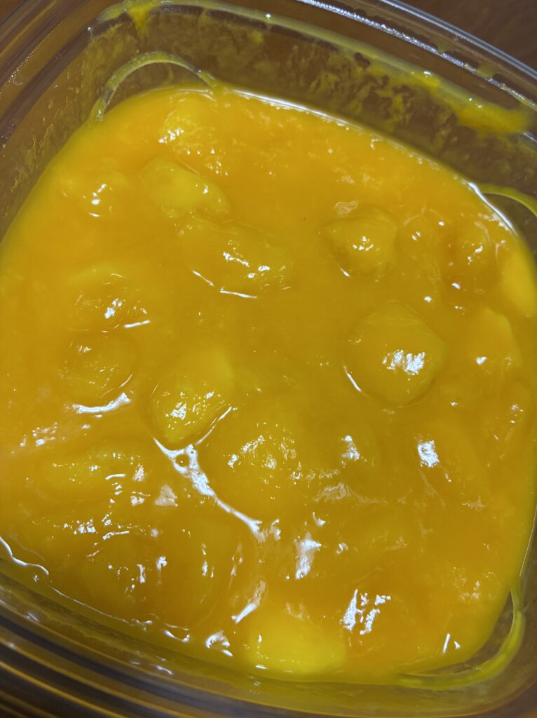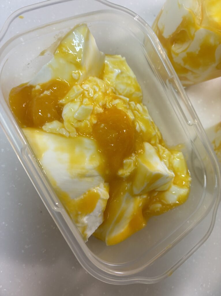 ……わかります。見た目は地味です。黄色いタッパーにマンゴーソースがかかってるだけ。インスタ映えとは程遠い。