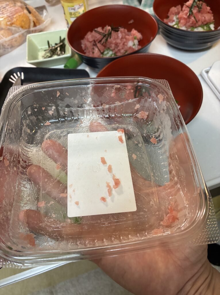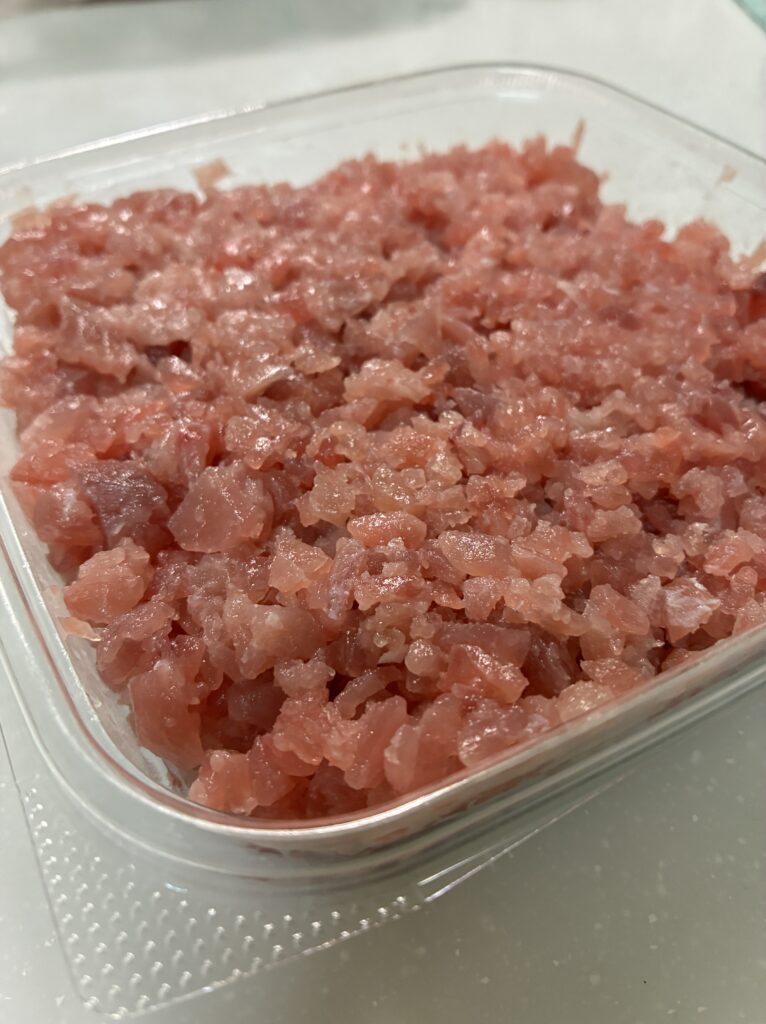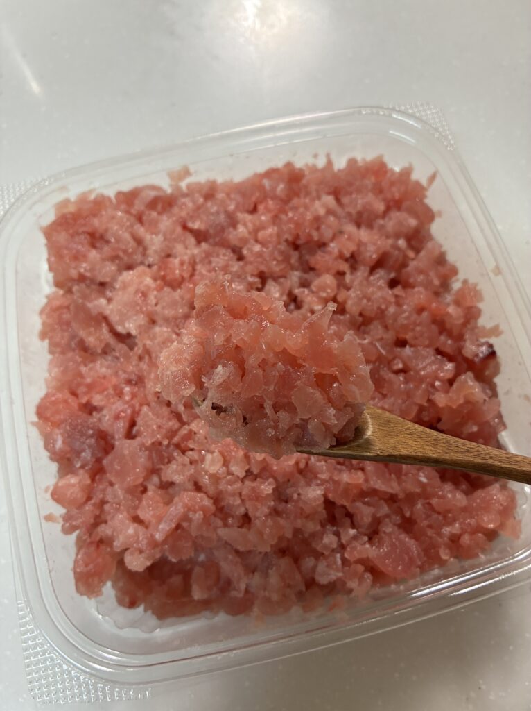 包丁でトントンと叩いたような粗めの粒で、まぐろを食べている感覚がちゃんとあります。ただし、粒が大きい分、筋が口に残ることがまれにあります。これはまぐろあるあるですね。
