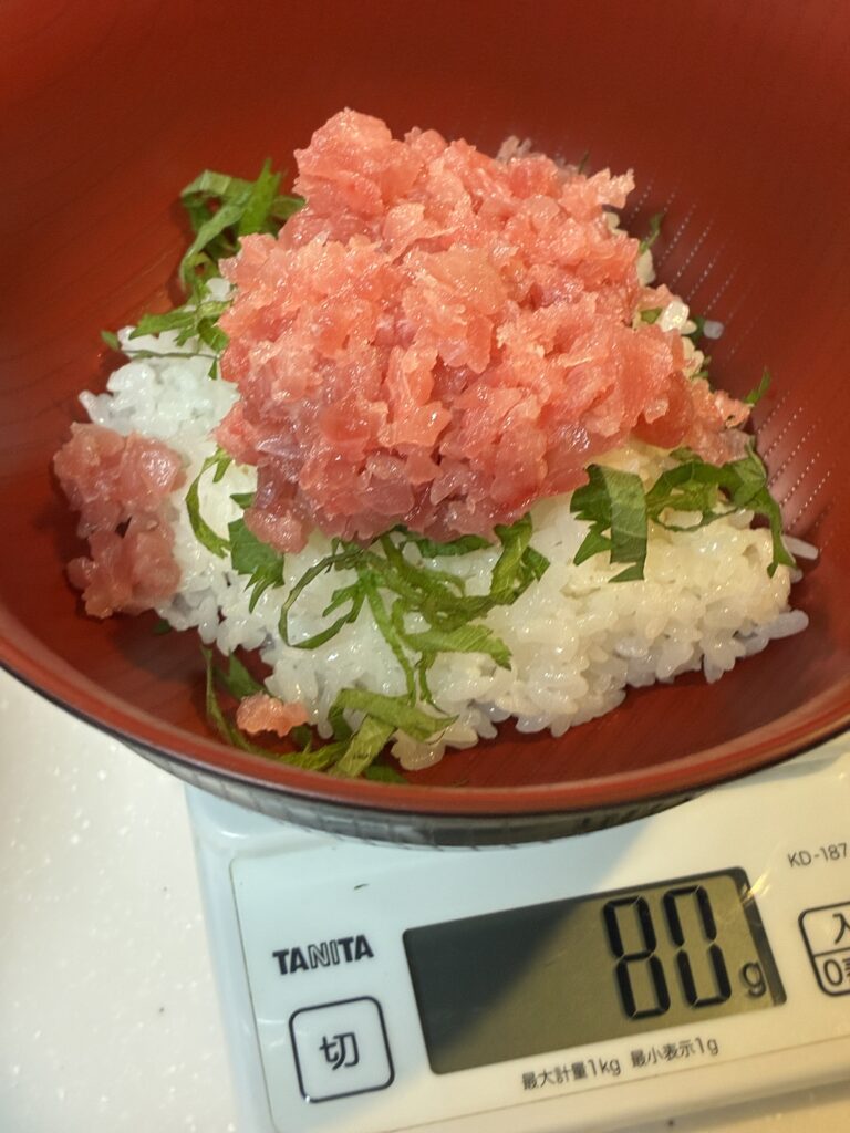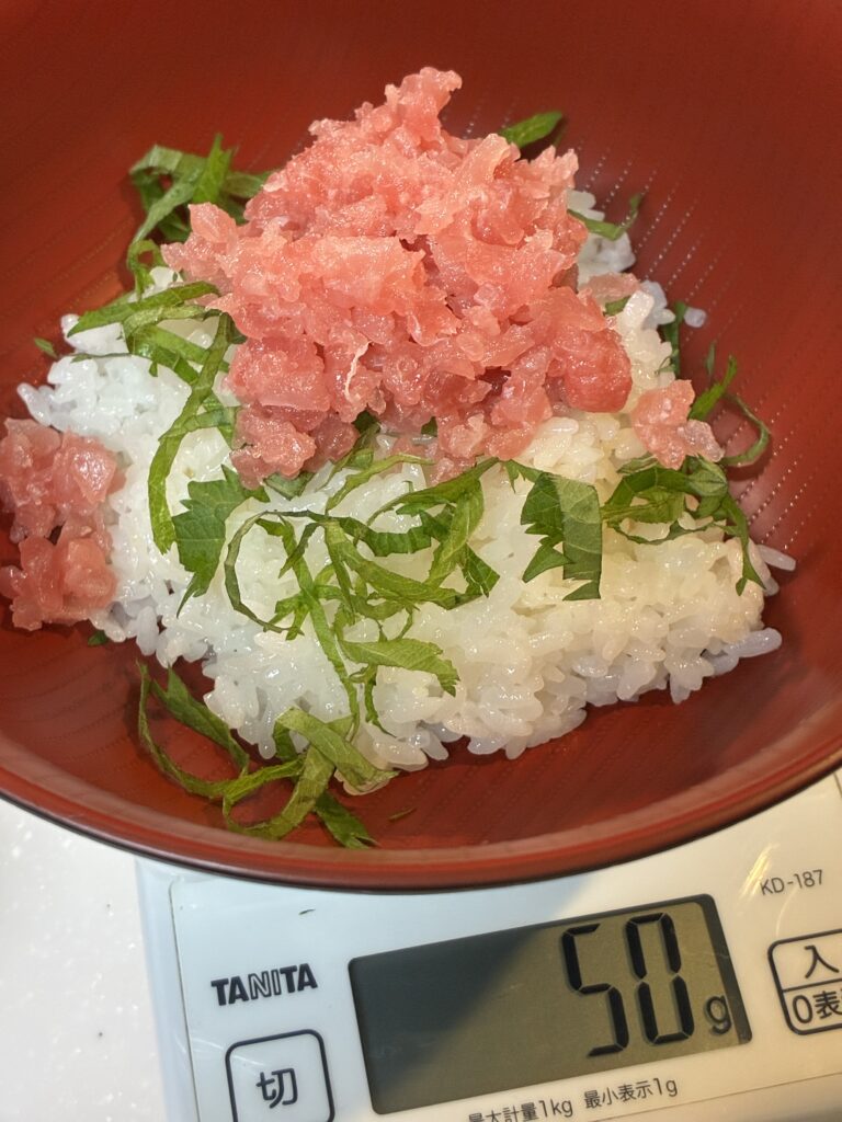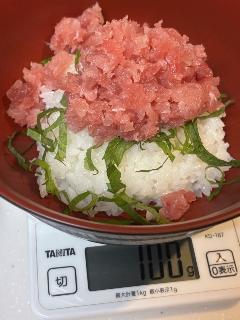 レシピサイトを調べると、1人前の分量は、まぐろたたき(ネギトロ)50g~150gと様々でした。ただ、印象としては1人前80gのサイトが多かったですね!