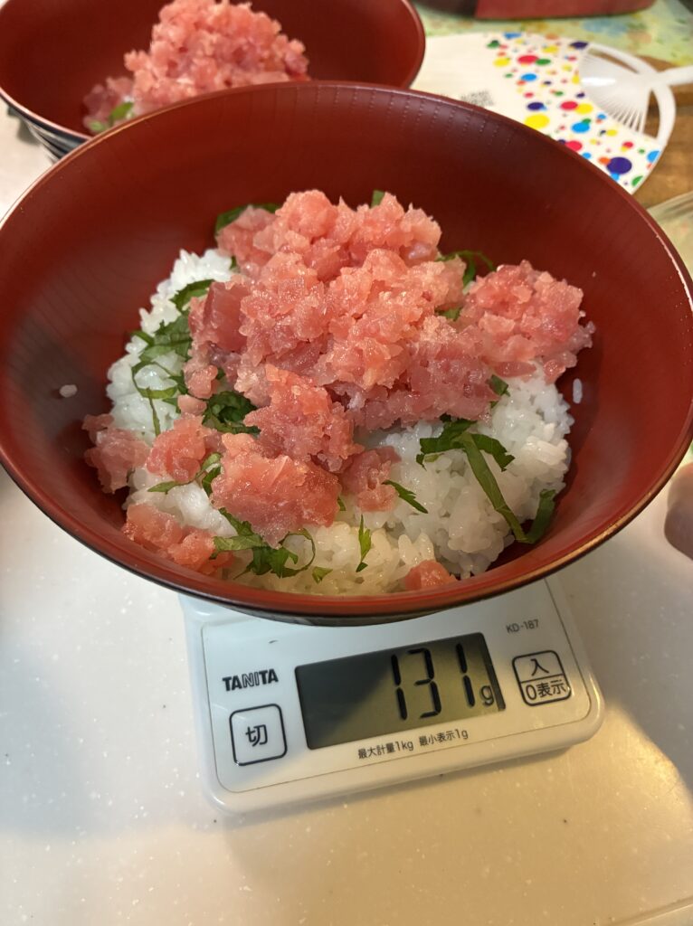 管理人・奥さん・娘はご飯150g+まぐろたたき100g。